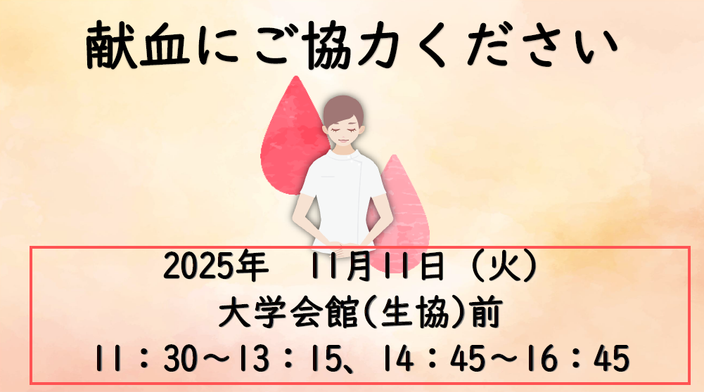 以下の日程で、献血車ひまわり号が来校します。 お時間のある方は、ぜひご協力ください。