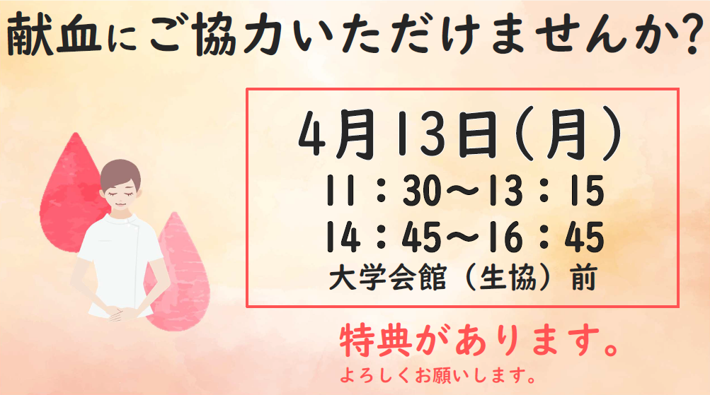 以下の日程で、献血車ひまわり号が来校します。 お時間のある方は、ぜひご協力ください。