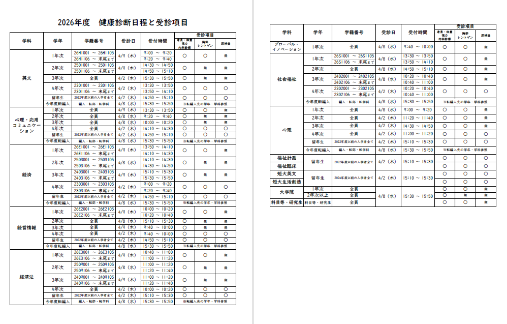 | ※ 指定された日時に受診してください。 ※ 事前に「保健調査WEB」の回答を済ませてください。 (新入生は入学手続で修了しているため不要) |
